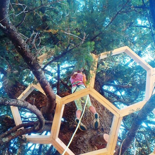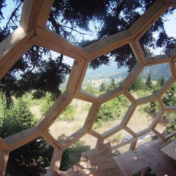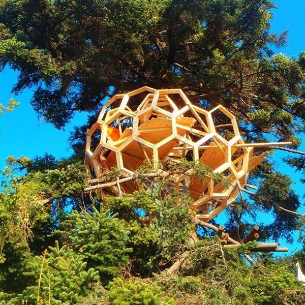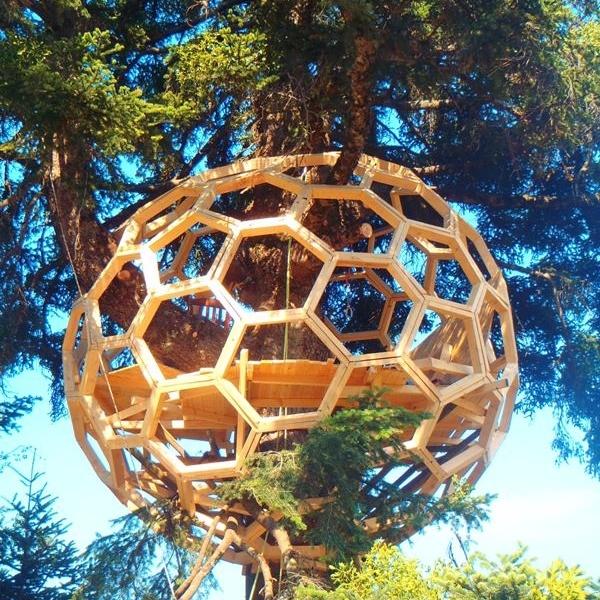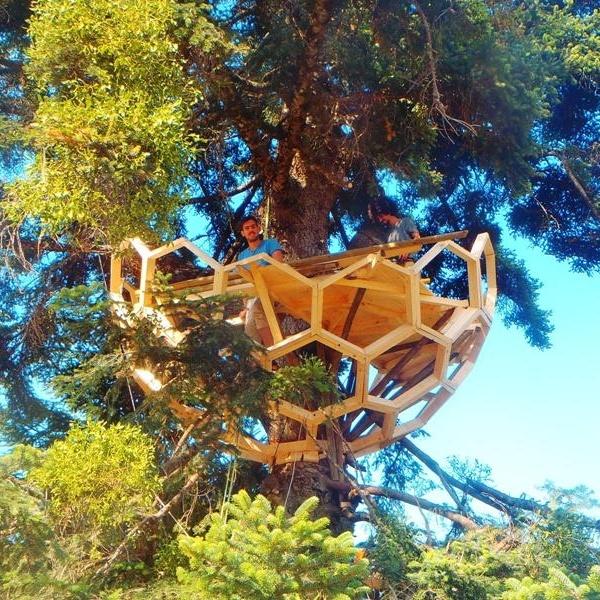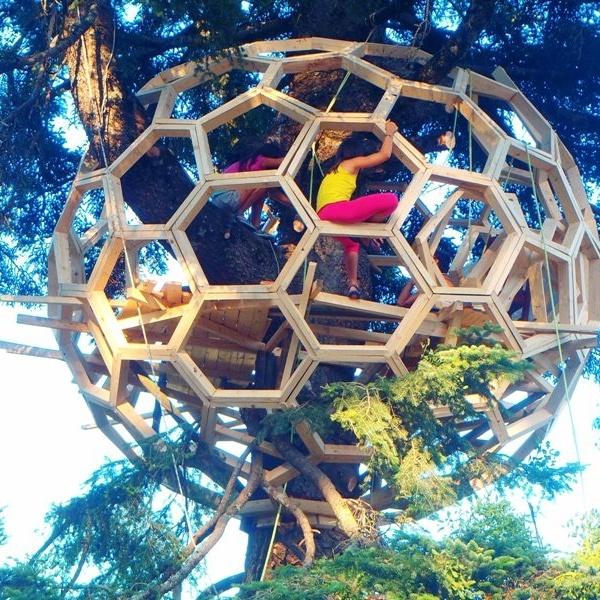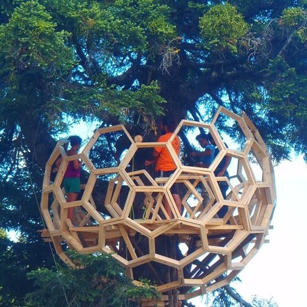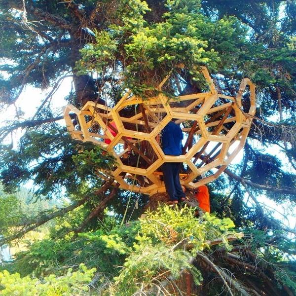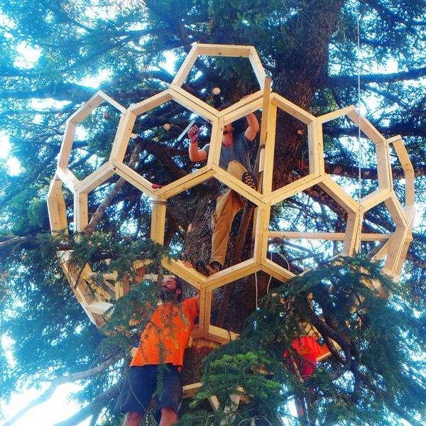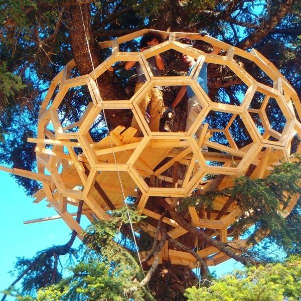 One of the most demanding constructions we have done. It’s a geodesic sphere 4.2 meters in diameter, that is installed on a gigantic pine tree that is up to 12 meters high. It was done during a six days workshop.