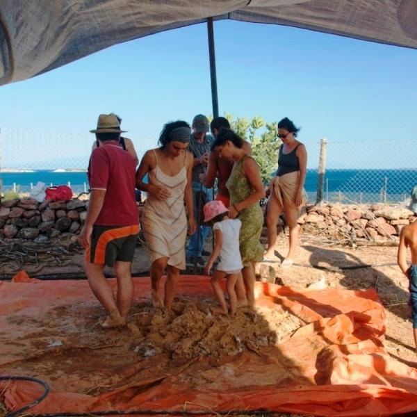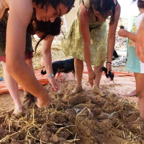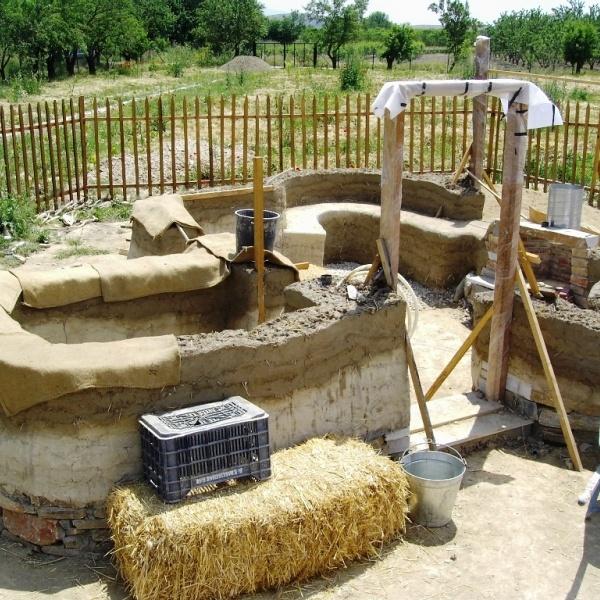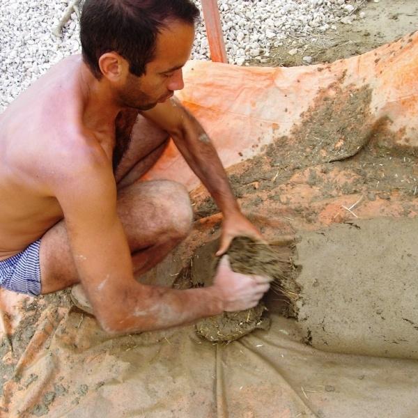 Cob is one of the most ancient methods of building with natural materials. Legs and hands are used to form masses of clay mixed with sand and straw which then are being placed one on top of the other creating that way monolithic constructions of great stability. The word cob is an English one that means small ball.